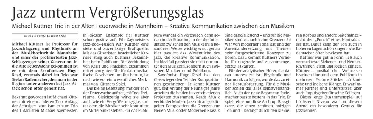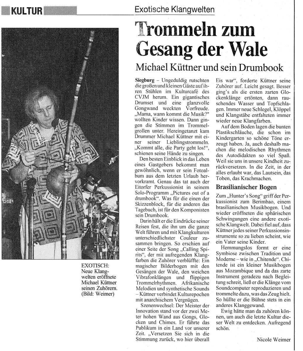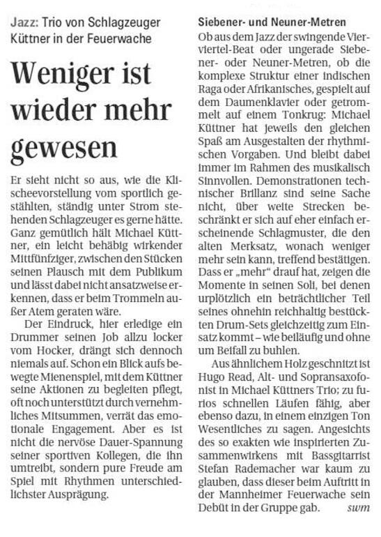 (Kölnische Rundschau)....am Schlagzeug saß eine Art Prophet, einer, der jederzeit weiß, was kommt. Küttner begleitete nicht, er synchronisierte..... Die Akzente des Schlagzeugers wirkten maßgeschneidert und dennoch voller Spontaneität und Unberechenbarkeit.