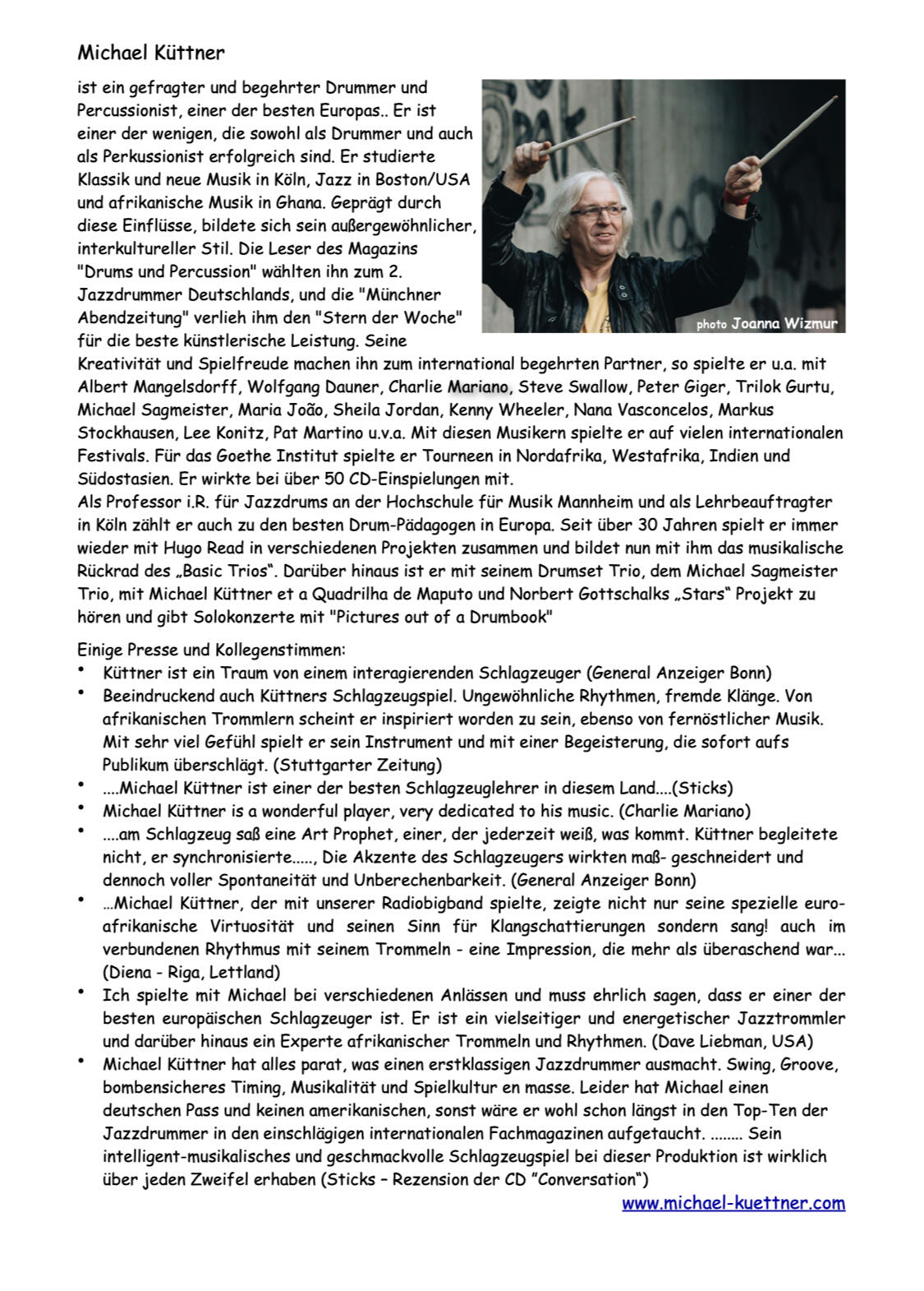 Michael Küttner ist ein gefragter und begehrter Drummer und Percussionist, einer der besten Europas. Er ist einer der wenigen, die sowohl als Drummer und auch als Perkussionist erfolgreich sind.Er studierte Klassik und neue Musik in Köln,Jazz am Berklee College in Boston/USA (als 1. Stipendiat für Jazzdrums vom DAAD)und afrikanische Musik mit Mustapha Tettey Addy in Kokrobite, Ghana.Alle diese Einflüsse formen seinen ungewöhnlichen interdisziplinären Stil. Die Leser des Magazins "Drums und Percussion" wählten ihn zum 2. Jazzdrummer Deutschlands, und die "Münchner Abendzeitung" verlieh ihm den "Stern der Woche" für die beste künstlerische Leistung. Seine Kreativität und Spielfreude machen ihn zum international begehrten Partner. Durch seine langjährige Arbeit mit Peter Gigers legendärer „Family of Percussion“ und durch seine nun schon 45 jährige Zusammenarbeit mit dem Gitaristen Michael Sagmeister wurde er international bekannt und geschätzt.Er spielte auf zahllosen Internationalen Festivals auf der ganzen Welt und trat mit vielen namhaften Musikern auf wie z.B. Albert Mangelsdorff, Wolfgang Dauner, Charlie Mariano, Steve Swallow, Trilok Gurtu, Maria João, Sheila Jordan, Kenny Wheeler, Nana Vasconcelos, Zakir Hussein, L Shankar, Markus Stockhausen, Lee Konitz, Pat Martino, Dave Liebman, David Samuels, Darius Askenasi, Otto Wolters, Norbert Gottschalk, Paul Shigihara, Uli Beckerhoff, Klaus Lage, Alex Wiska (Oriental Rock), Manni von Bohr u.v.a.m.Für das Goethe Institut spielte er Tourneen in Nordafrika, Westafrika, Indien und ganz Südostasien. 2011, 2013 und 2017 war er in Brasilien und 2017 auch in Argentinien auf Tournee. Seit 1994 ist er auch in Maputo aktiv und spielte dort z.B. auf dem 1. Internationalen Jazz Festival 1996 und trommelte 1998 für das Projekt Friends across the Border. Seit 2004 realisiert er immer wieder Konzerte und Projekte mit Matchume Zango und der Quadrillha de Maputo. Er spielte über 50 CD´s ein und wirkte an unzähligen Radioproduktionen und Live-Recordings (Audio und Video) mit. Auf zahlreichen Solokonzerten mit seinem Programm „Pictures out of a Drumbook“ hat er sich auch als Solist einen Namen gemacht.Er zählt zu den besten Jazzpädagogen Europas und ist ein beliebter und gefragter Dozent für Kurse und Cliniks und schrieb bis 2020 30 Jahre lang Workshops für das Magazin drums & percussion. Er war Gutachter und Mitglied der Auswahlkommission des DAAD. Viele seiner Alumni gehören heute zur Spitzte der deutschen und auch europäischen Szene. Viele wurden mit DAAD Stipendien ausgezeichnet und konnten so z.b. in den USA ihren Master machen.