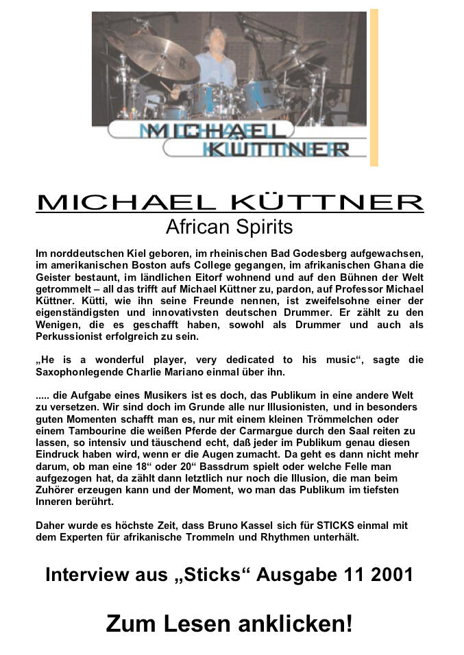 ....Als Musiker gilt Michael Küttner seit ca. 12 Jahren als einer der besten Schlagzeuger und Perkussionisten nicht nur der deutschen, sondern auch der europäischen Szene.